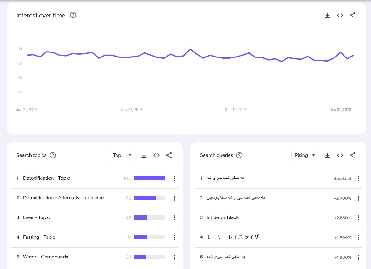 What’s particularly valuable appears beneath this graph – both search topics and search queries related to your chosen category. These suggestions are the key to discovering emerging trends.