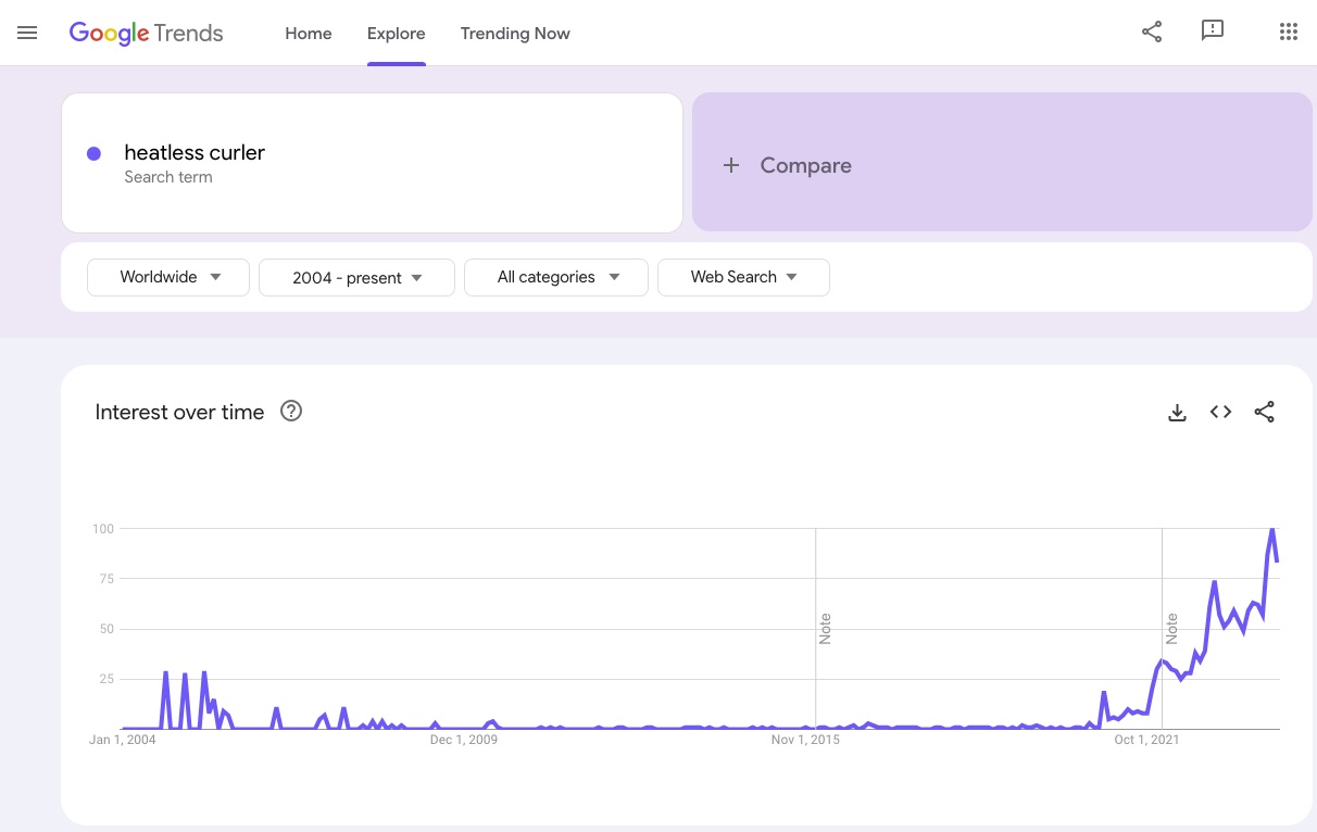 A more promising pattern appears when examining dropshipping trending items like heatless curlers. The graph shows gradual yet persistent growth in interest over time.