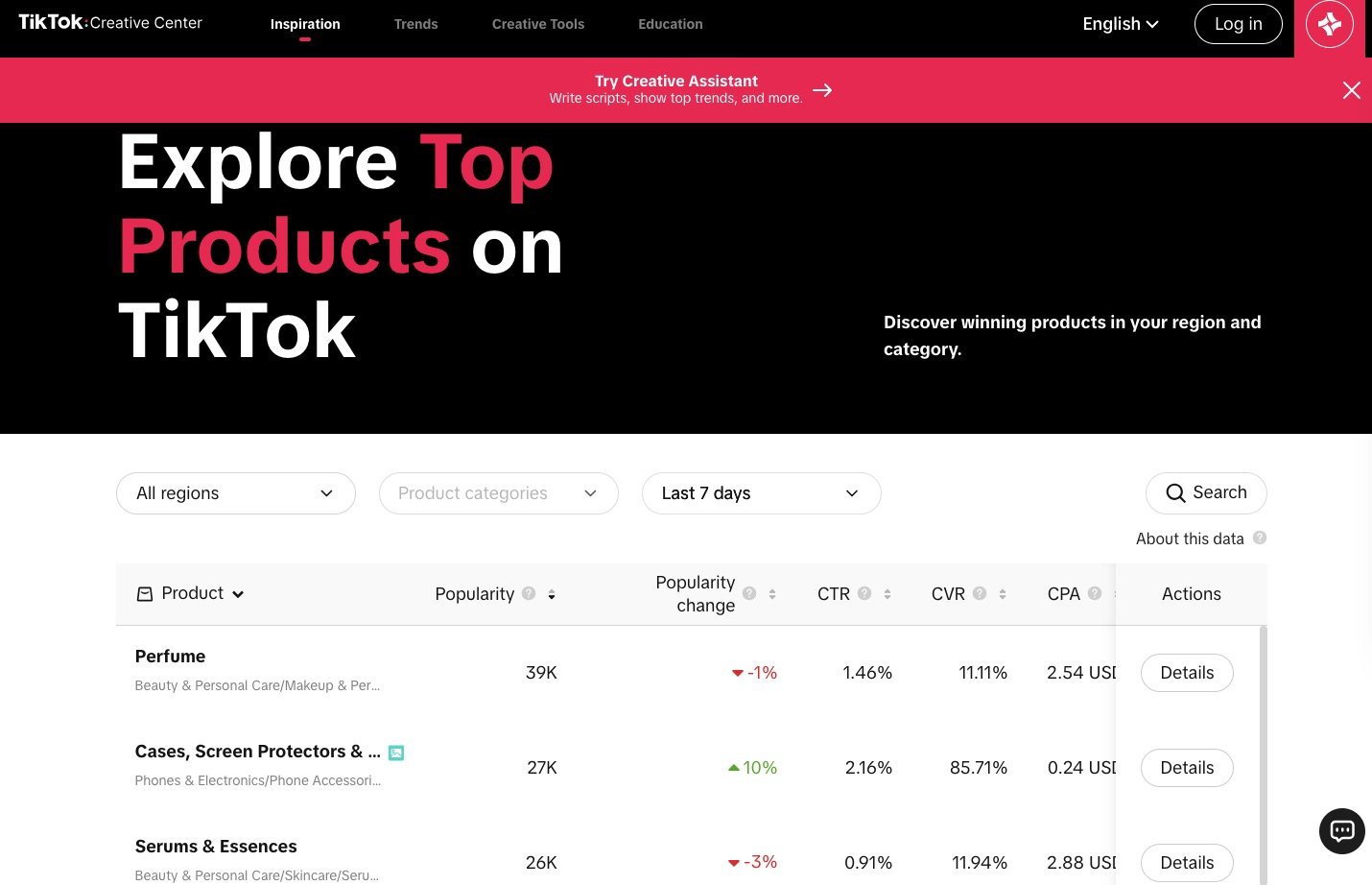 The Top Products feature empowers advertisers to discover promising items for content creation. Users can refine their search by selecting specific geographical regions, periods, and product categories.
