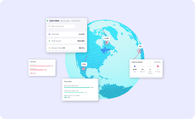 Theo dõi hiệu suất theo thời gian thực với bản đồ 3D tương tác, giám sát đơn hàng hiện tại, khách truy cập và các số liệu quan trọng để tối ưu hóa doanh số.