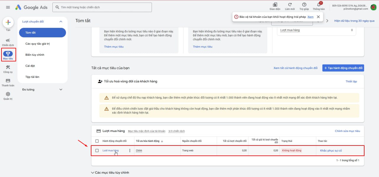 Nếu mã được gắn đúng, Google Ads sẽ hiển thị conversion đang hoạt động