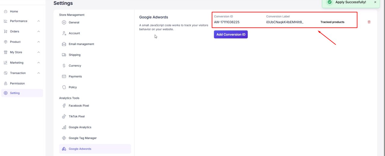 Sau khi gán thành công, mã Google Ads sẽ hiển thị trong danh sách Google Ads của store.