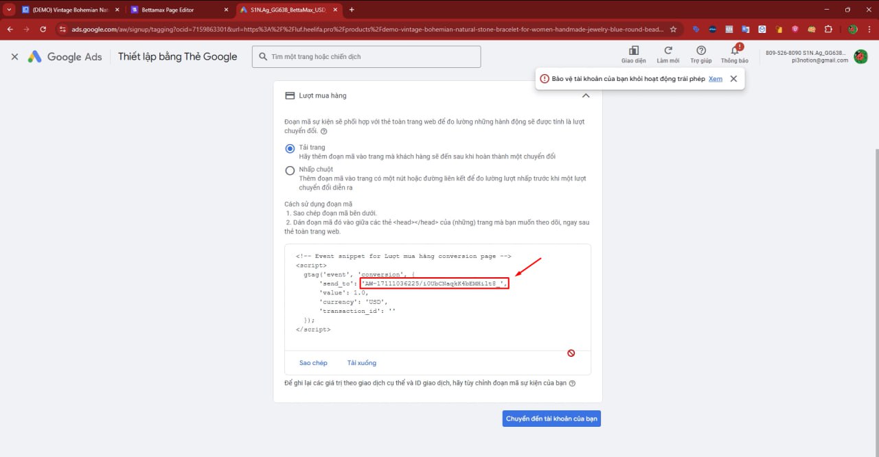Bước 3: Gắn mã Google Ads vào BettaMax