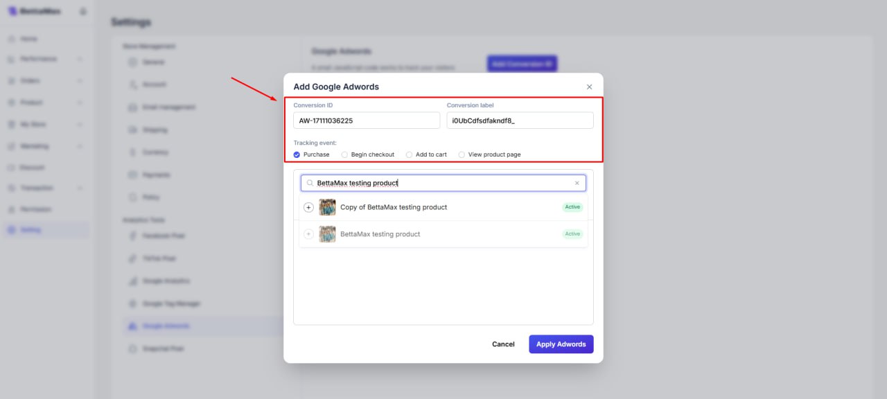 Sau khi đã lấy được Conversion ID và Conversion Label từ Google Ads, bạn quay trở lại trang quản trị store trên nền tảng BettaMax để tiến hành gắn mã và kích hoạt theo dõi chuyển đổi. Đây là bước quan trọng giúp BettaMax gửi dữ liệu hành vi khách hàng về Google Ads một cách chính xác.