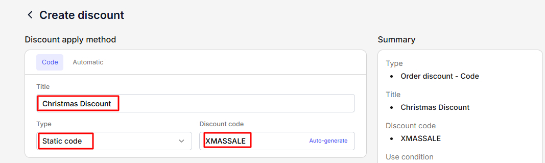Discount apply method: Bạn có hai lựa chọn chính là sử dụng Code (Mã) hoặc Automatic (Tự động).